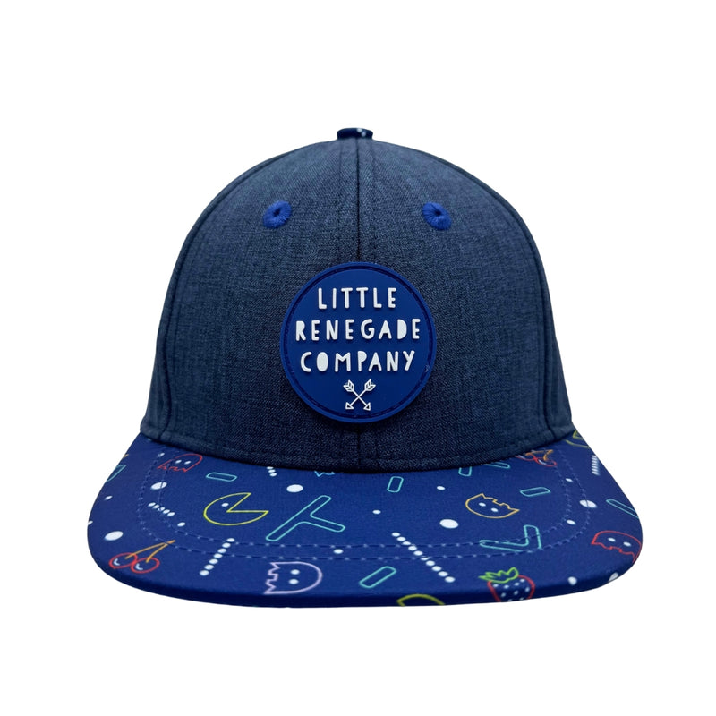 A black cap featuring a monochrome uppercase alphabet print and a black PU leather peak. The front displays a circular patch with the "Little Renegade Company" logo, adding a stylish touch.