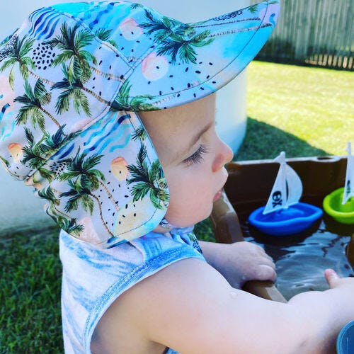 This reversible flap hat features a dreamy watercolour palm tree and geometric print on one side, and a chilled-out grey on the other. Whether your little one is feeling bold or neutral, this hat flips to match the moment—making it the go-to for sunny day adventures.